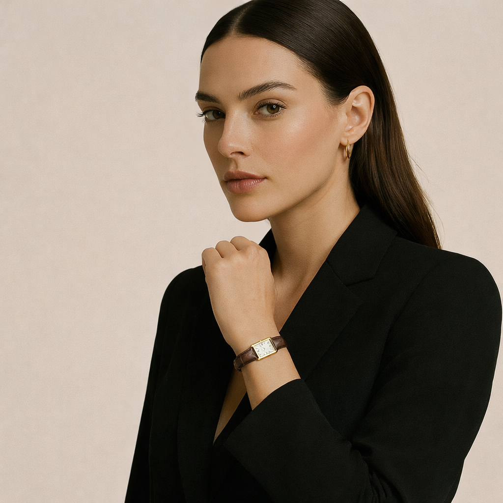 Light dances across our signature rectangular case, shimmering with diamond like brilliance and subtle precision. Finished to jewelry standards and paired with fine Italian leather, Lueur Étoiles is designed for women whose elegance speaks softly, yet lingers.