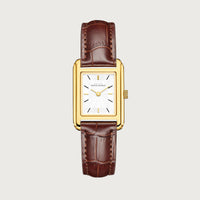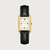 The Lueur Legende from the Lueur collection is a 26mm watch that exemplifies modern elegance. It features a gold polished stainless steel rectangular case paired with a clean white dial, protected by a durable sapphire glass. Secured with a Mysterieux Black croco leather strap and finished with a gold-plated butterfly clasp, this timepiece is powered by the reliable Japanese Miyota GL20 movement. A sophisticated expression of timeless style.