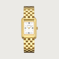 The Lueur Classique Etoiles – Etoiles Edition from the Lueur collection is a 23mm diamond-accented timepiece crafted for refined brilliance. With a luminous white dial framed by a gold polished stainless steel rectangular case, it is both elegant and enduring. Protected by premium sapphire glass and fastened with a matching ciel stainless steel bracelet, this watch blends luxury and precision, powered by the Japanese Miyota GL20 movement. A sparkling tribute to timeless glamour.