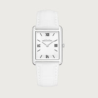 The Reveuse Legende from the Reveuse collection is a 26.0mm watch that exemplifies modern elegance. It features a silver polished stainless steel rectangular case paired with a clean white dial, protected by a durable sapphire glass. Secured with a Ensoleille White croco leather strap and finished with a gold-plated butterfly clasp, this timepiece is powered by the reliable Japanese Miyota GL20 movement. A sophisticated expression of timeless style.